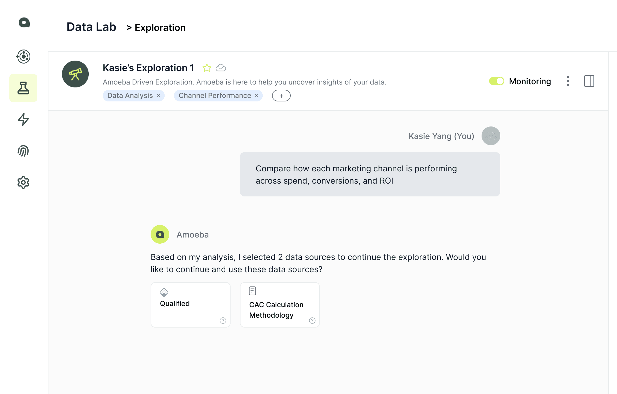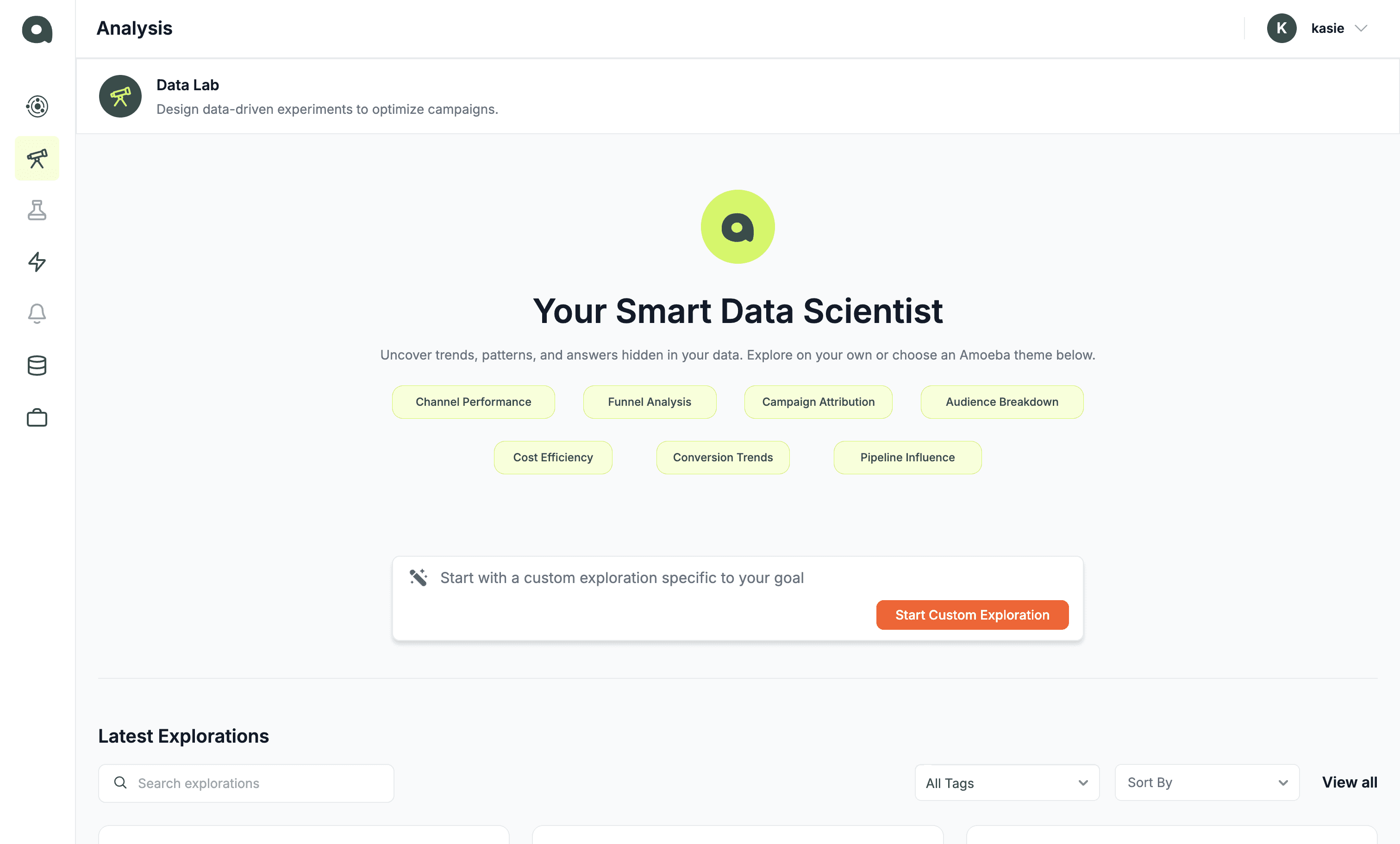 Data Lab: Users can create data explorations to uncover insights in their data. Users will chat with Amoeba, who behaves like a data scientist. Key deliverables: