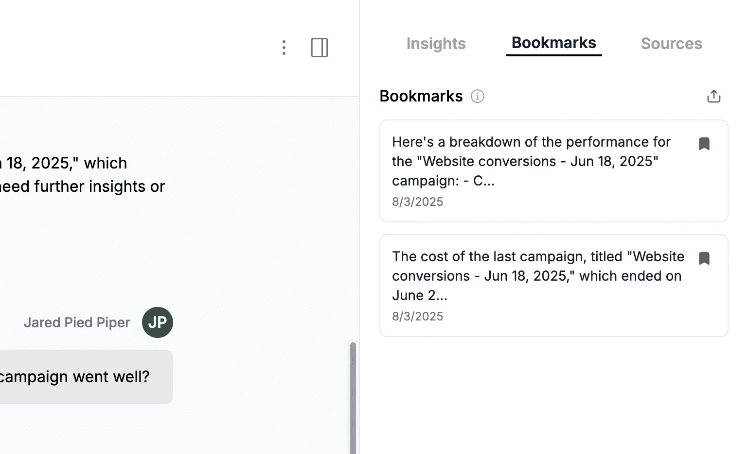 Iterations of Chat Interface Page with Insights, Bookmarks, and Sources